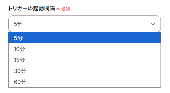 トリガーの起動タイミングは、5分、10分、15分、30分、60分のいずれかで設定できます。