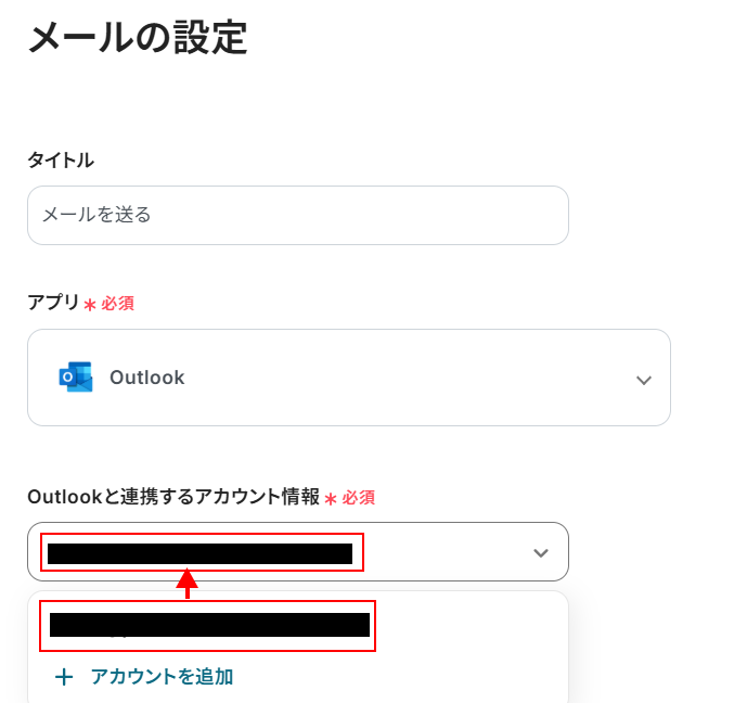 Outlookと連携するアカウント情報はプルダウンメニューから選択できます。 選択したいアカウントがない場合は、「+アカウントを追加」をクリックしてください。