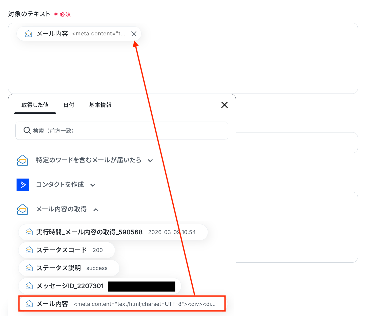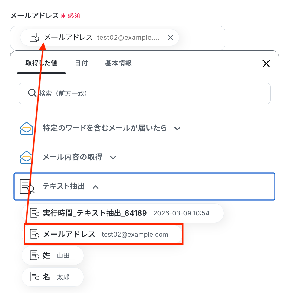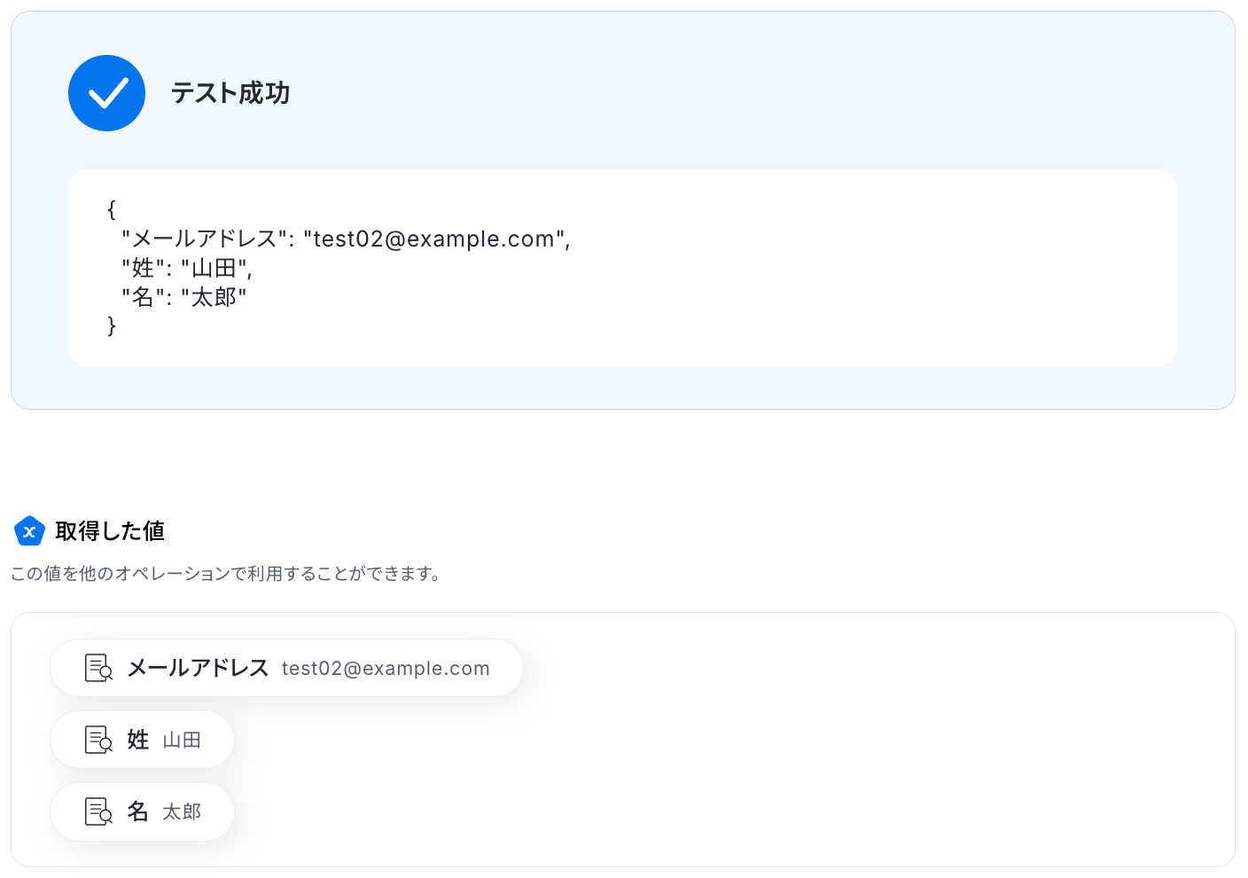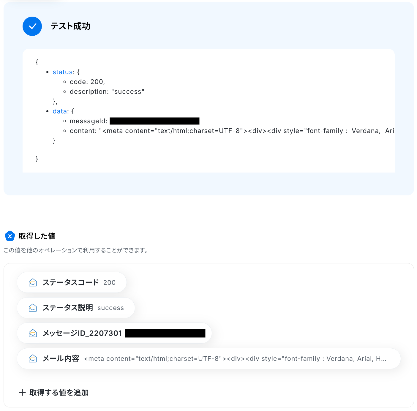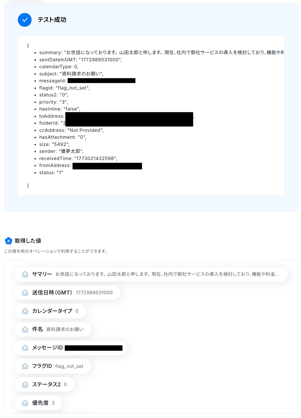 テストに成功すると、取得されたメール内容が表示されます。 以下の取得した値はこの後のステップで利用できます。