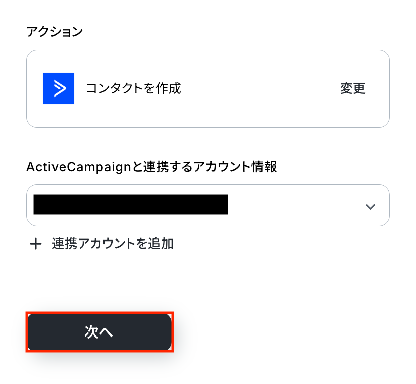 アクションはあらかじめ設定されているため、そのまま内容を確認してください。 ActiveCampaignと連携するアカウント情報に問題がなければ、「次へ」をクリックします。
