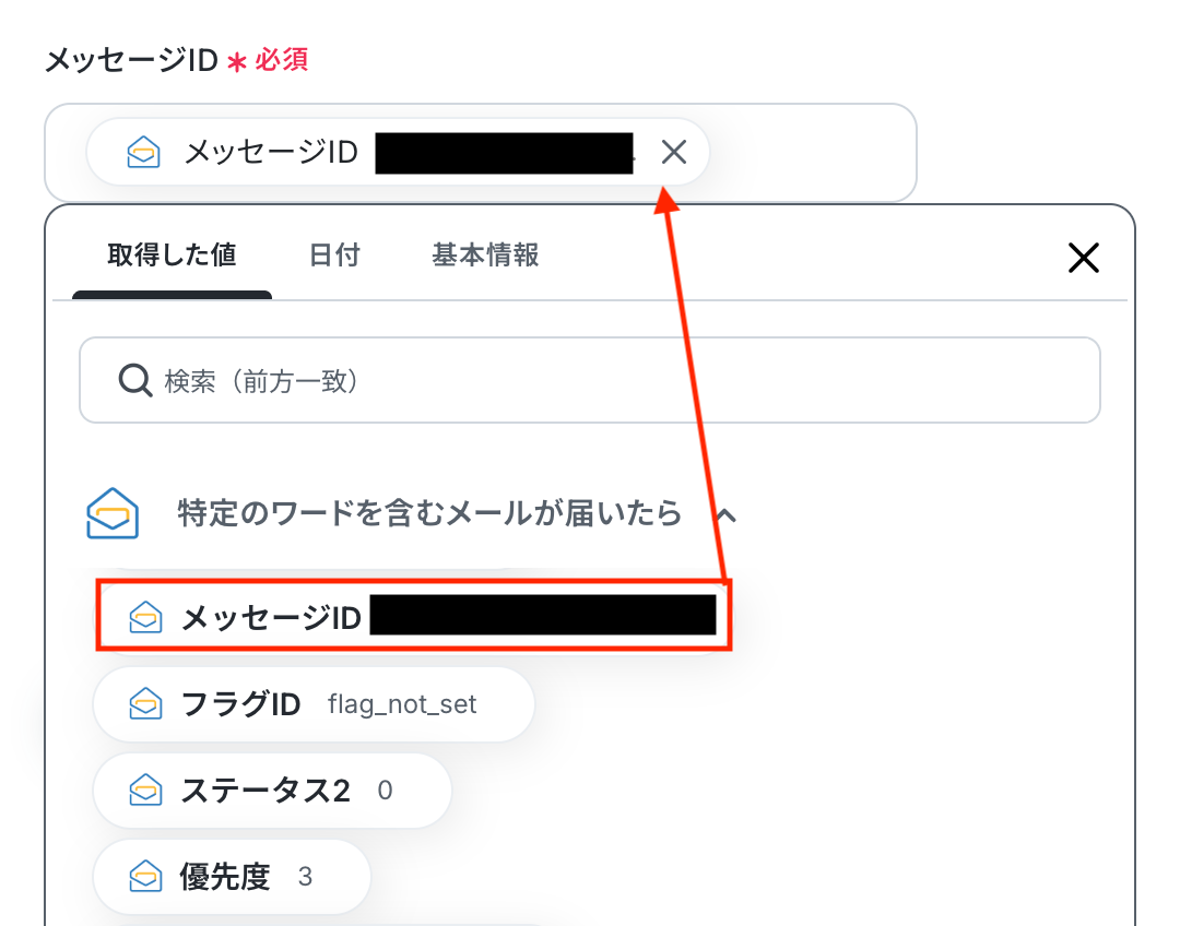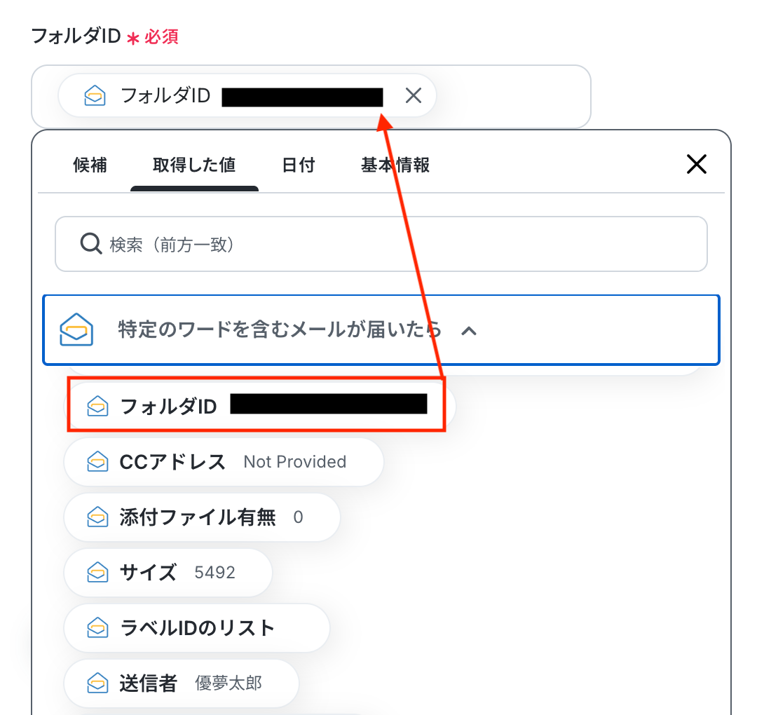 フォルダID メッセージID 入力欄をクリックすると、前のステップでZoho Mailから取得した値が表示されるので、選択して入力しましょう。 取得した値を活用することで値が固定化されず、フローボットを起動するたびに最新の情報を自動で反映できます。