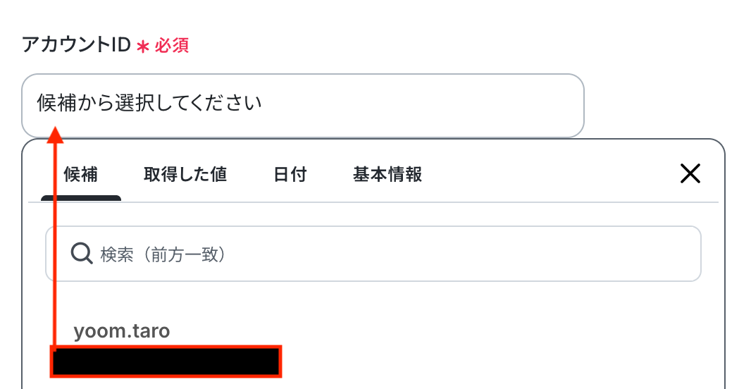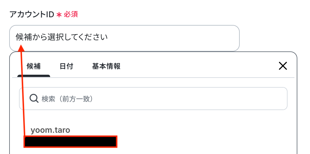 アカウントID 入力欄をクリックするとマイアプリ連携をしたアカウントから候補が表示されるので、対象の項目を選択しましょう。
