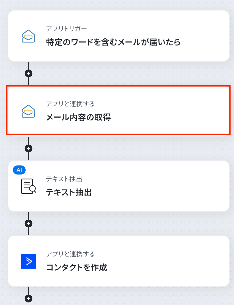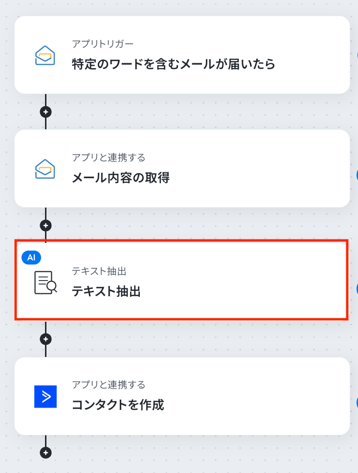 前のステップでZoho Mailから取得したメール内容を対象に、AIで特定のテキストを抽出します。
