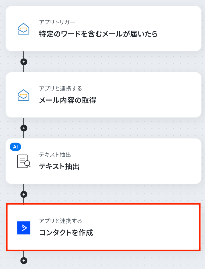 Gmailのトリガー設定では、自動化の対象としたいメールに付与するラベルを任意で設定できます。 AI機能でテキストデータを抽出する際に、メール本文から取得したい項目(氏名、会社名、メールアドレスなど)を任意で設定可能です。 ActiveCampaignのアクション設定では、コンタクトを追加する先のリストIDを任意で設定できます。 ■注意事項