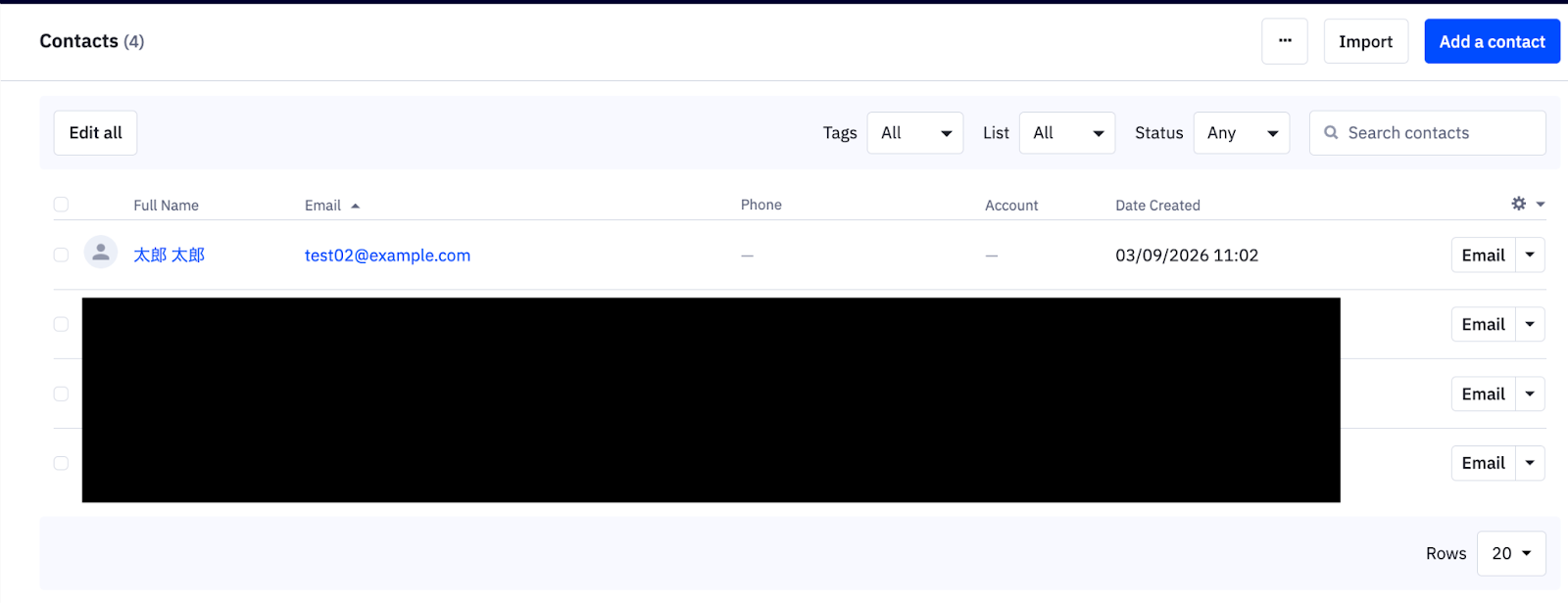 テストが成功したらActiveCampaignの画面を開き、実際にコンタクトが作成されているかを確認してみましょう。 今回は下記のとおり作成されていました!
