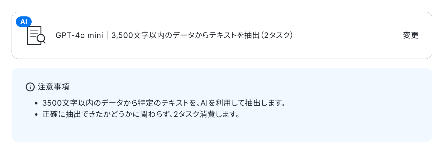 変換タイプは「GPT-4o mini|3,500文字以内のデータからテキストを抽出(2タスク)」 がデフォルトで設定されているため、そのまま内容を確認してください。