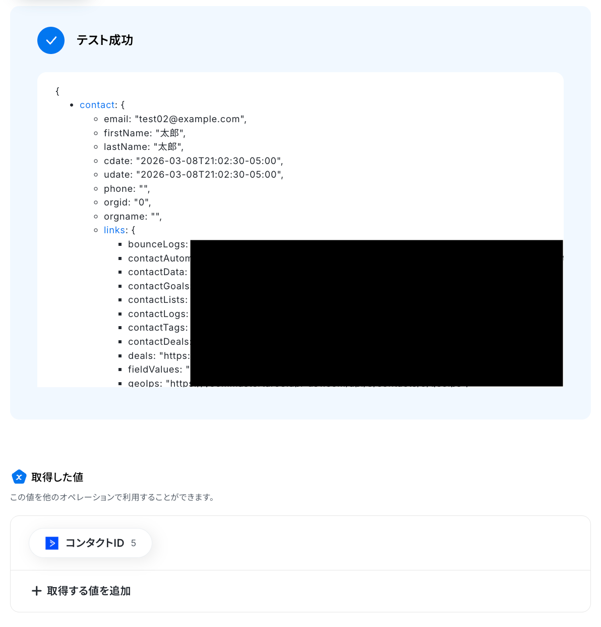 以下の画像の取得した値を利用し、この後のステップでActiveCampaignでコンタクトを作成できます。