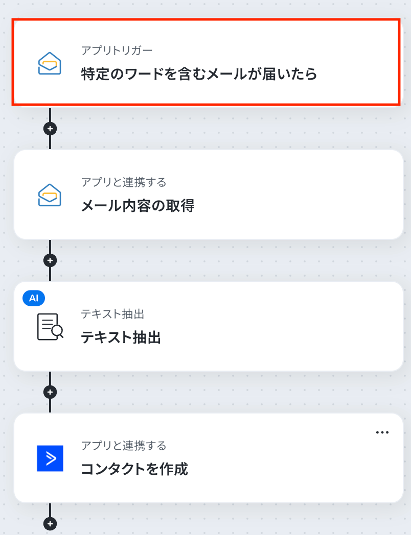 はじめに、GmailとActiveCampaignをYoomと連携します。 次に、トリガーでGmailを選択し、「特定のラベルのメールを受信したら」というアクションを設定します。 次に、オペレーションでAI機能の「テキストからデータを抽出する」アクションを設定し、受信したメール本文から名前や会社名などの情報を抽出します。 最後に、オペレーションでActiveCampaignの「コンタクトを作成」アクションを設定し、抽出した情報を紐付けてコンタクトを自動で作成します。 ※「トリガー」:フロー起動のきっかけとなるアクション、「オペレーション」:トリガー起動後、フロー内で処理を行うアクション