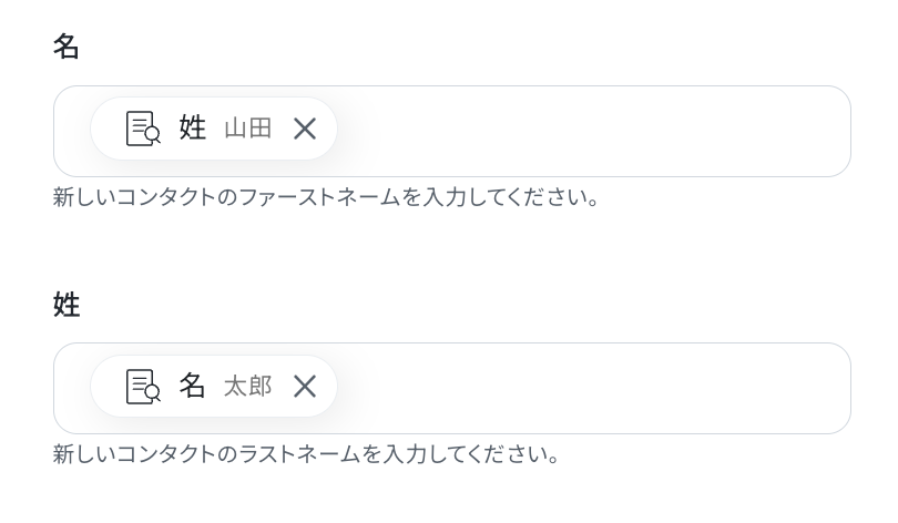 入力欄をクリックすると、前のステップでテキスト抽出した値が表示されるので、選択して入力しましょう。 なお、テキストを直接入力した部分は固定値とされるため、取得した値を活用せず設定を行うと毎回同じデータがActiveCampaignに登録されてしまうので注意が必要です。