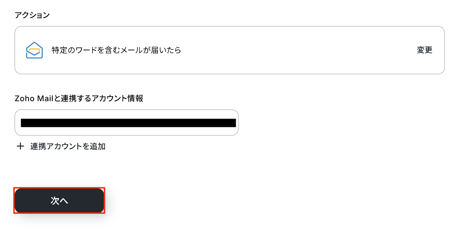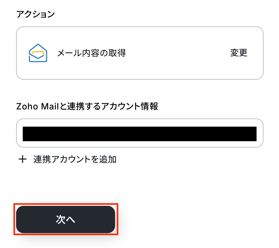 アクションはあらかじめ設定されているため、そのまま内容を確認してください。 Zoho Mailと連携するアカウント情報に問題がなければ、「次へ」をクリックします。