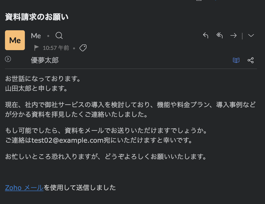 事前準備としてZoho Mailで特定のキーワードを含むメールを受信しておきましょう。 今回はテスト用に、特定のキーワード「資料請求」を含む以下のメールを受信しました。