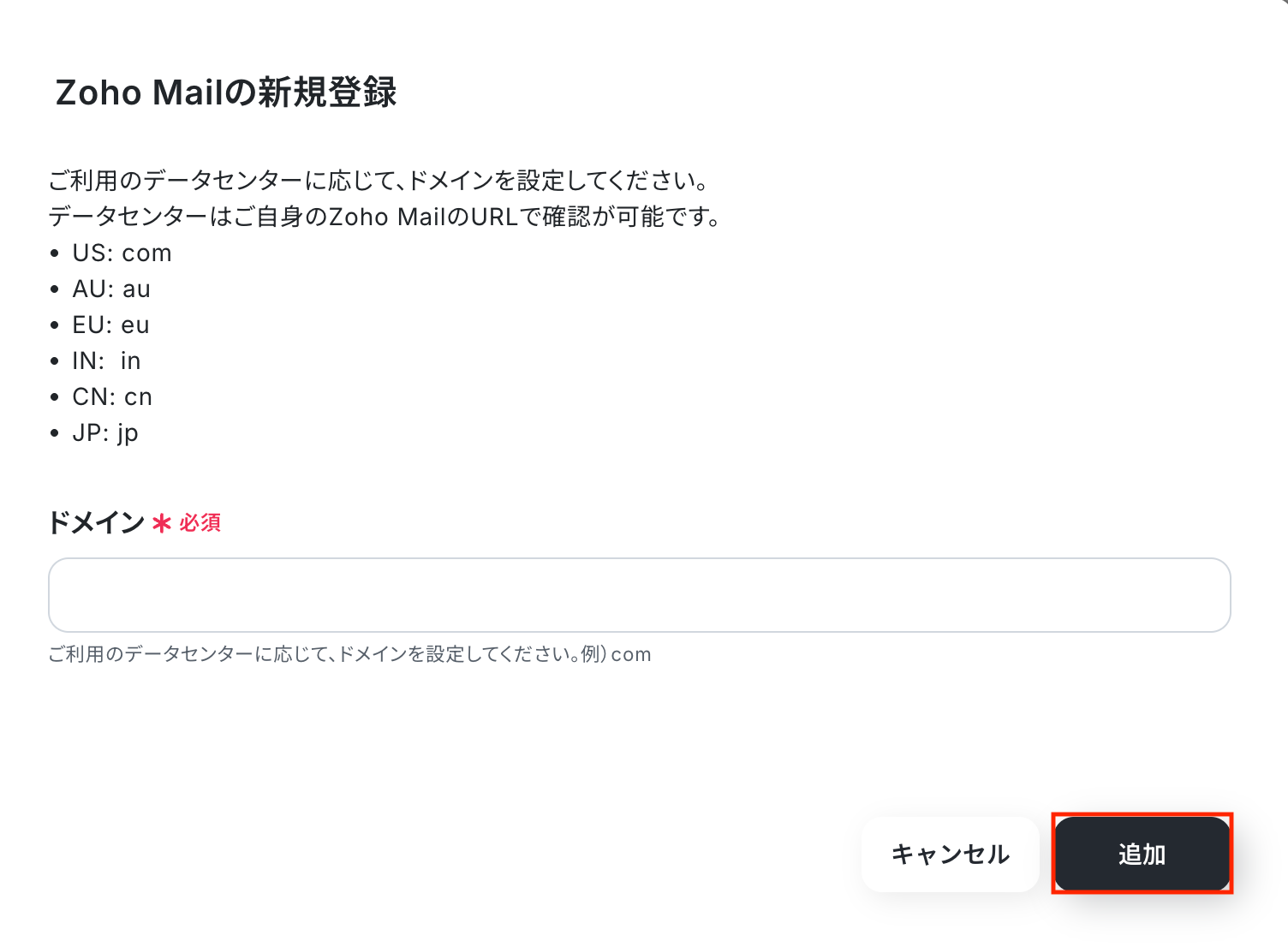 ドメイン 注釈に沿って入力し、「追加」をクリックします。