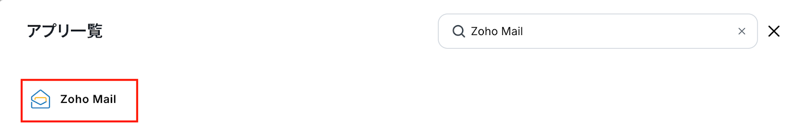 新規接続をクリックしたあと、アプリのメニュー一覧が表示されるのでZoho Mailと検索し、対象アプリをクリックしてください。