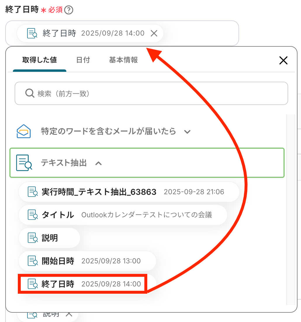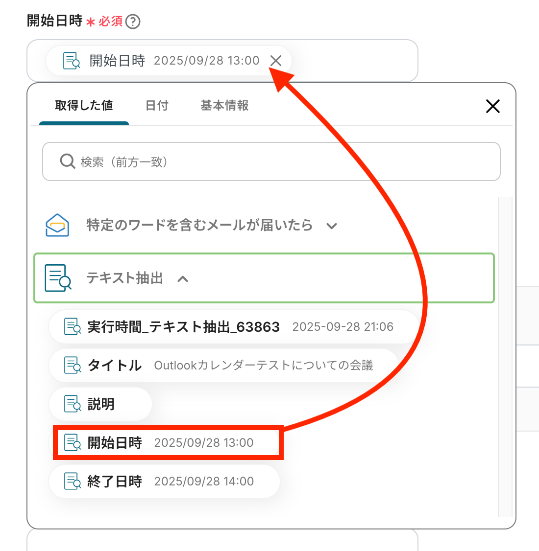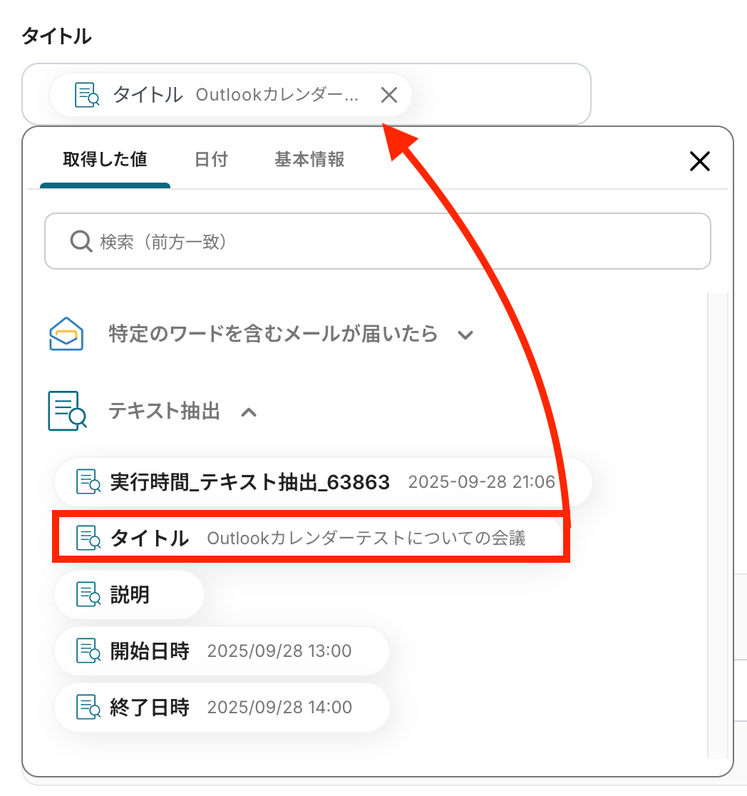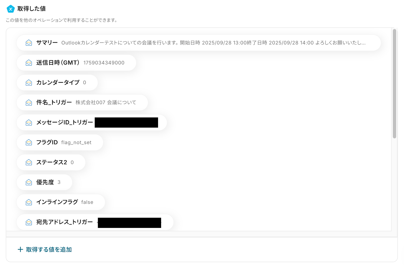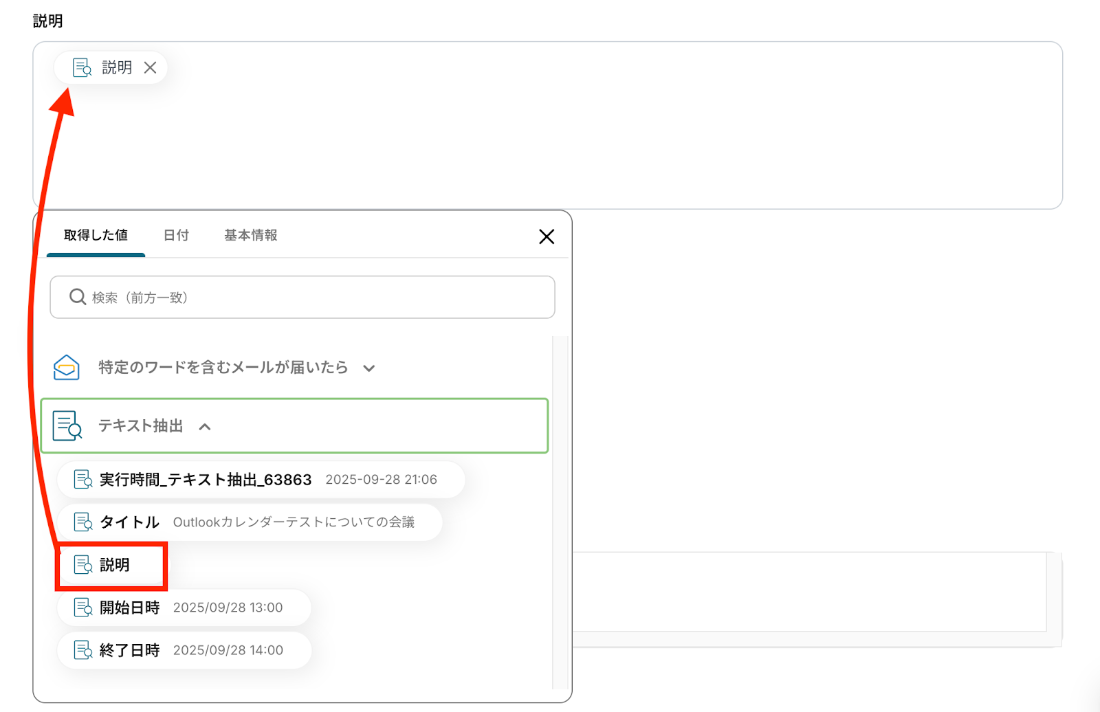 削除してしまった場合には、入力欄クリック時に表示されるトリガーアクションメニューから取得した値の「サマリー」を選択してください。