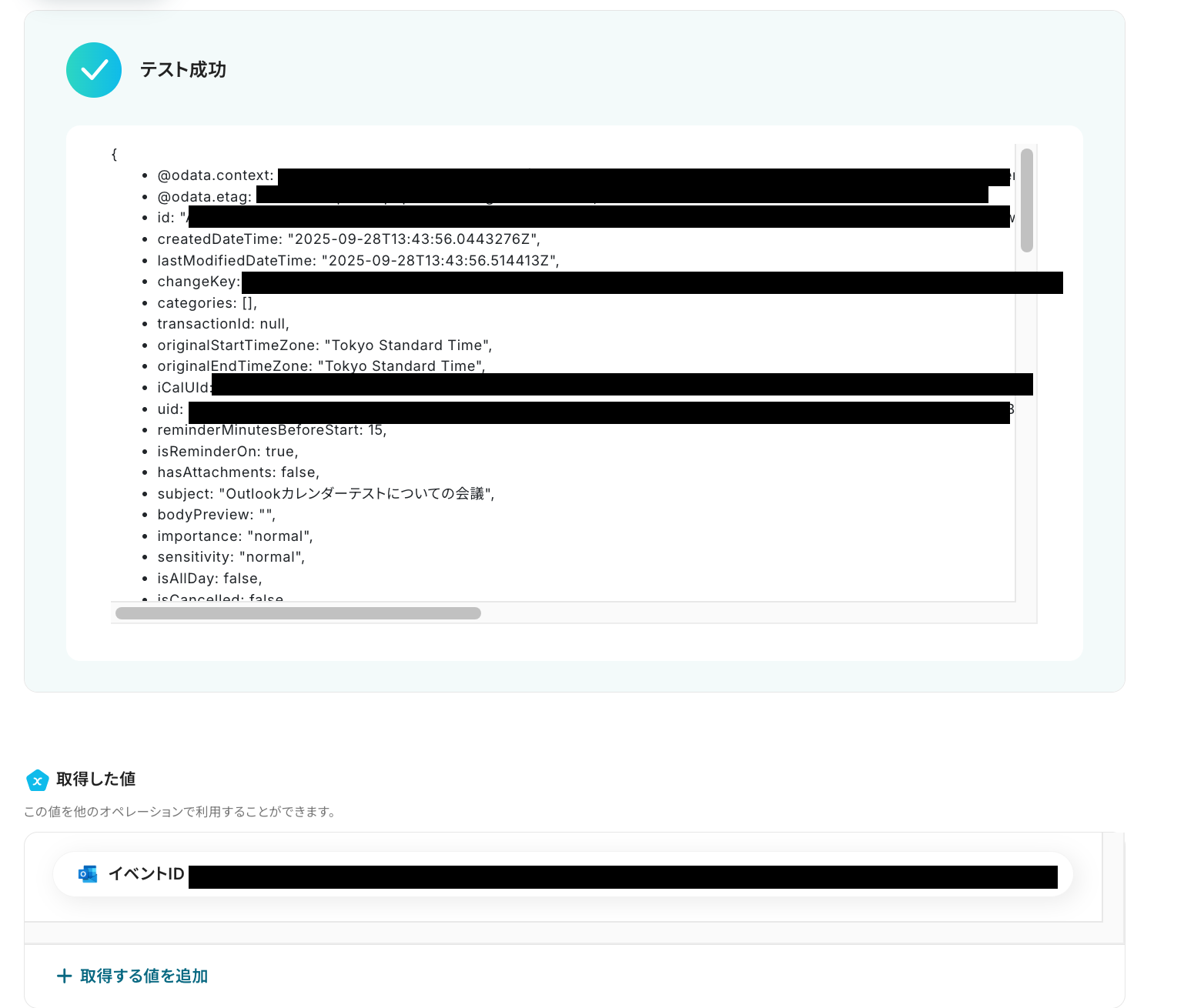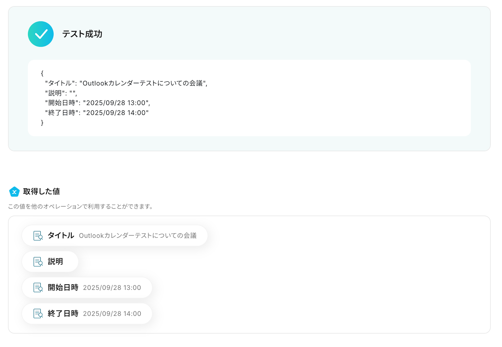 テストに成功すると、テスト成功画面が表示され、下記のように取得した値(アウトプット)が表示されます。