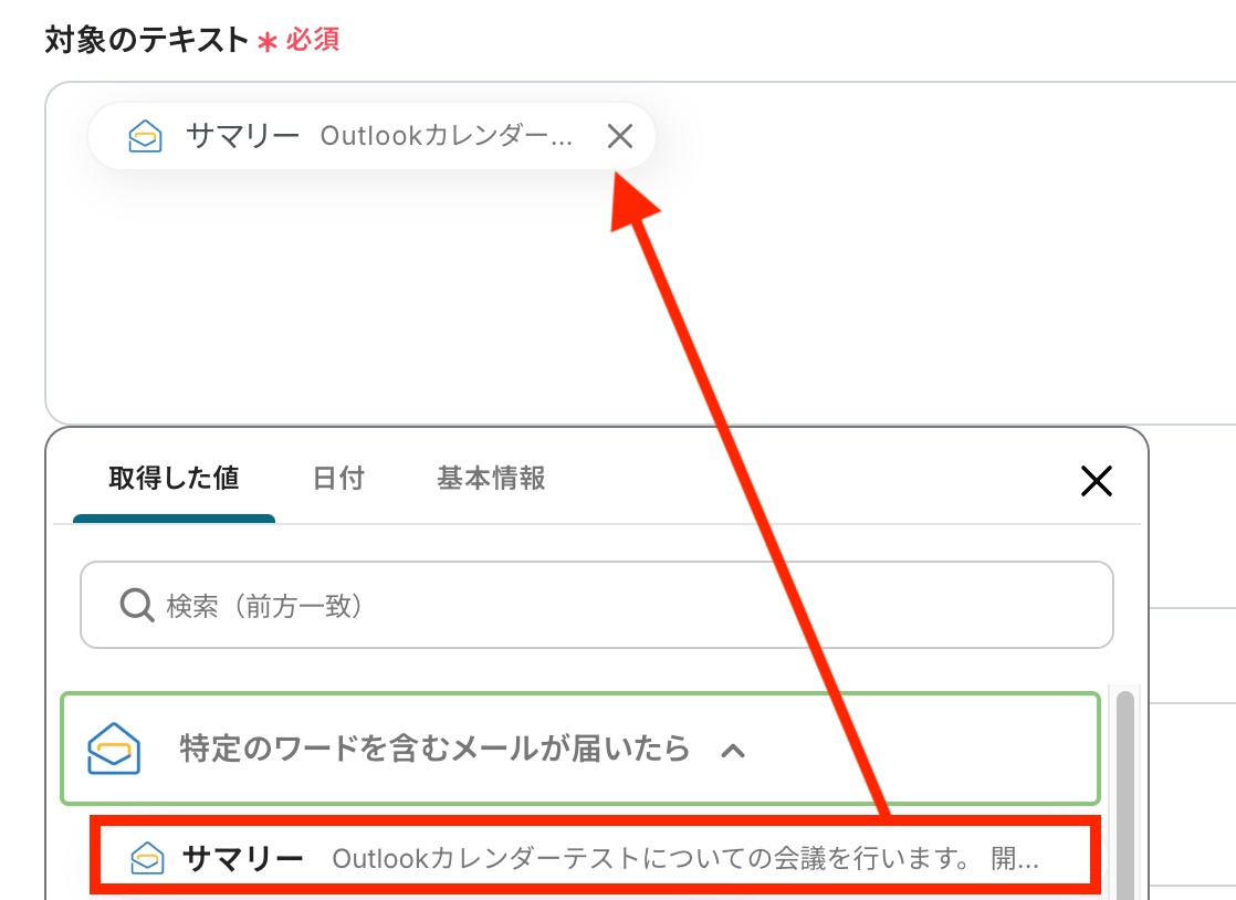 - 「対象のテキスト」にはデフォルトで、トリガーアクションで取得した「サマリー」が設定されています。