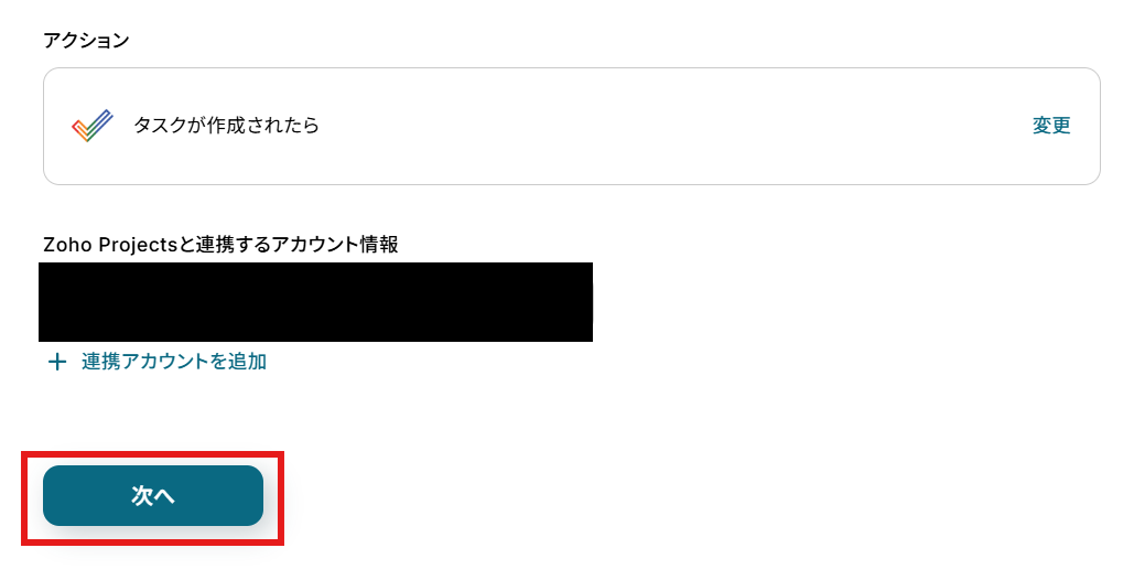 「アクション」はテンプレート通りのままでOKです! 「Zoho Projectsと連携するアカウント情報」を確認し、「次へ」をクリックして進んでください。