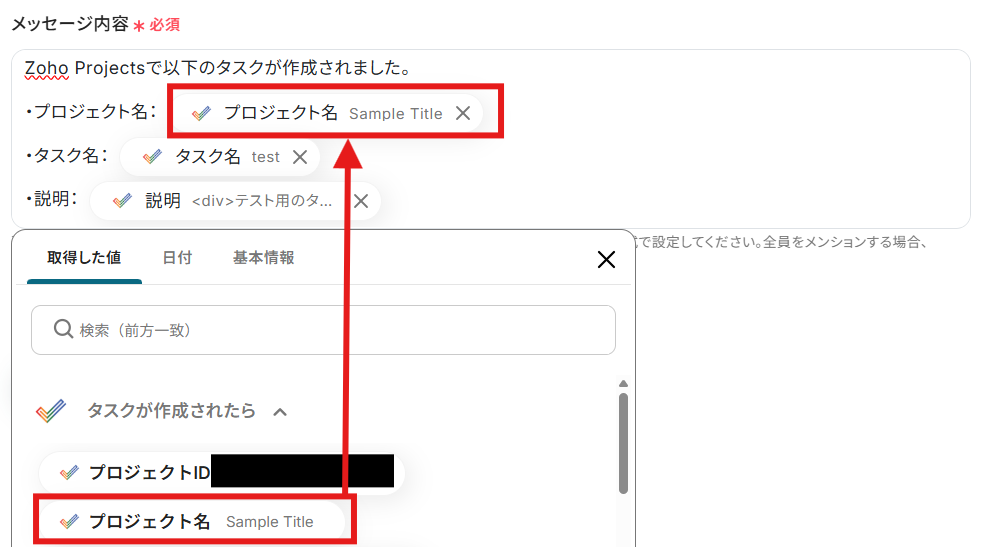 Zoho Projectsでタスクを作成する際に、タスク名や詳細説明といった項目を設定します これらの項目には、トリガーで取得したAsanaのタスク情報を変数として埋め込むことで、内容を動的に反映させることが可能です ■注意事項