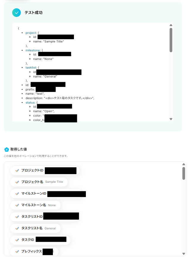 タスクを作成できたら「テスト」を行いましょう。 テストに成功すると「取得した値」に反映されます。