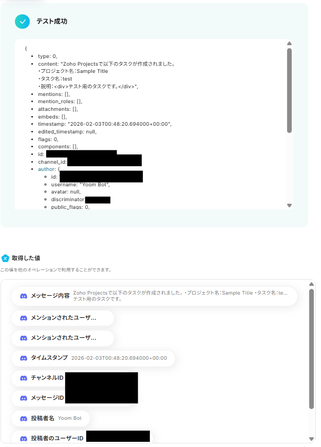 Discordへ通知を送信する際に、メッセージを送るチャンネルや本文の内容を任意で設定してください。Zoho Projectsから取得したタスク名や担当者などの情報を本文に含めることで、より分かりやすい通知が可能です。 ■注意事項