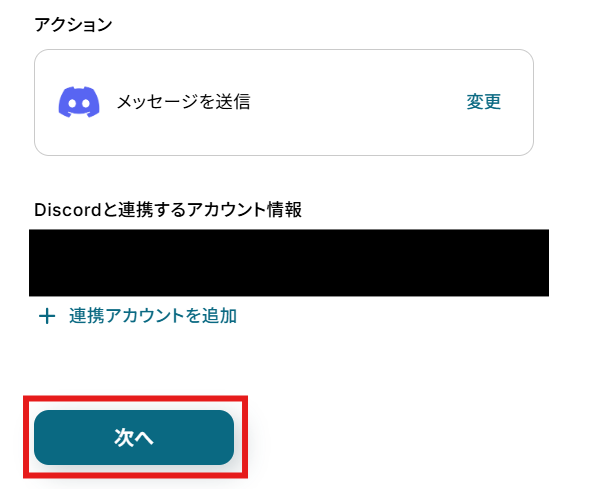 「アクション」はテンプレート通りのままでOKです! 「Discordと連携するアカウント情報」を確認し、「次へ」をクリックして進んでください。