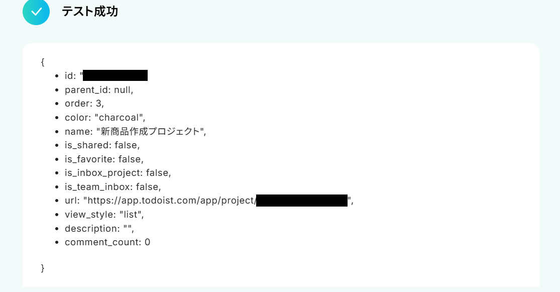- Todoistにプロジェクトを作成する際、Zoho Projectから取得したプロジェクト名など、連携したい情報を任意に選択して設定してください。