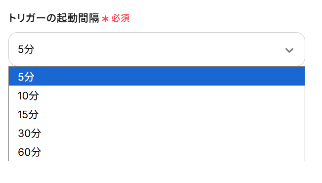 トリガーの起動間隔は、5分・10分・15分・30分・60分から選べます。