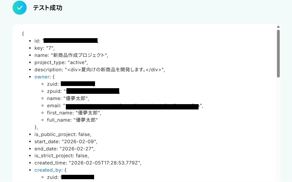 続いて、Zoho Projectsにプロジェクトが作成されたらフローボットが正しく起動するかテストを行います。