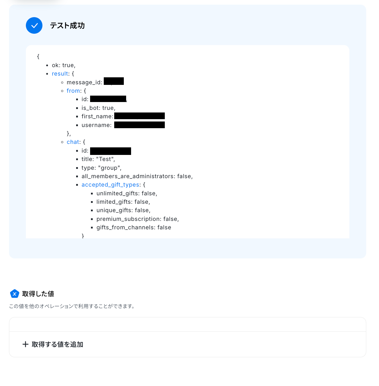 Telegramの「ボットがメッセージを受け取ったら」で取得したメッセージ本文、送信者情報、日時などの値を、後続のBox「フォルダを作成する」オペレーションで変数として埋め込むことが可能です。 ■注意事項