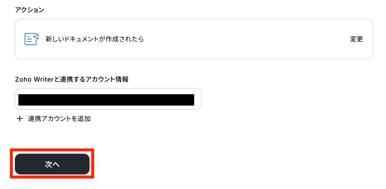 アクションは、「新しいドキュメントが作成されたら」のままで問題ありません。「次へ」ボタンをクリックします。