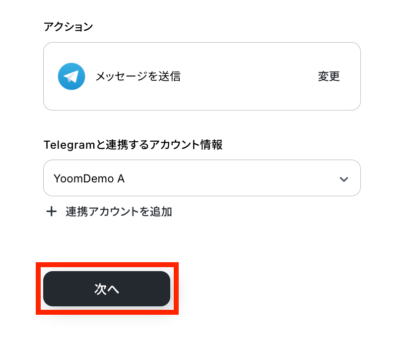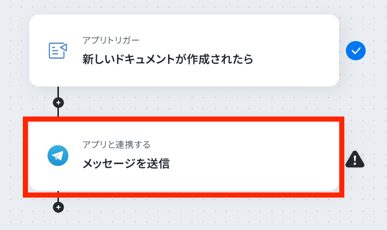 ステップ4:Telegramのアクション設定 取得した値を利用して、Telegramでメッセージを送信する設定を行います。 最後の赤枠をクリックしましょう。