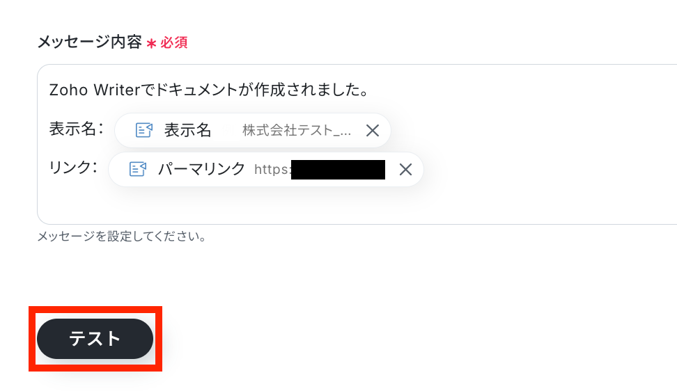Yoomの設定画面に戻り、「テスト」ボタンを押します。