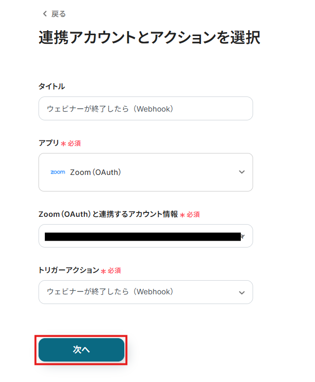 連携するアカウント情報には、ステップ1で連携したアカウント情報が反映されています。トリガーアクションはそのままにして、「次へ」をクリックしてください。