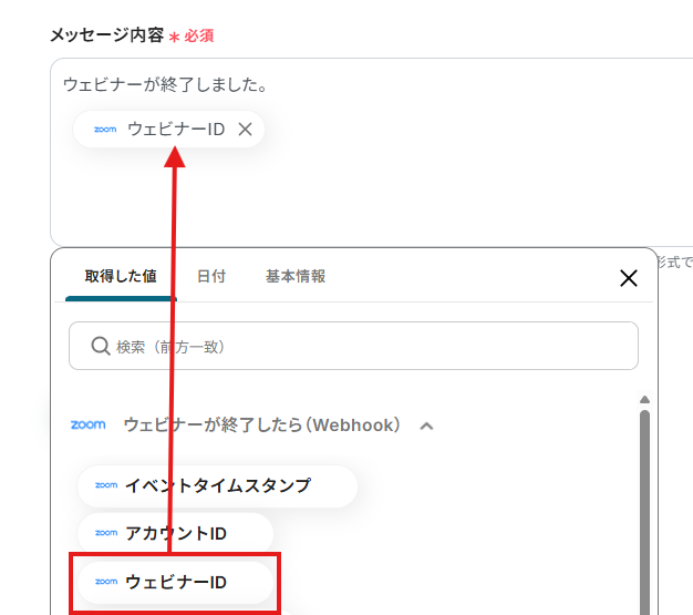 「メッセージ内容」は、入力欄をクリックして表示される取得した値から選択できます。