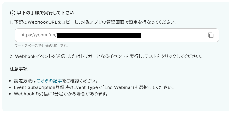 3.表示された画面で、以下画像の手順・注意事項に沿って、Webhookの設定をします。