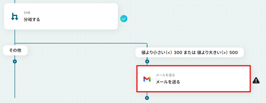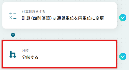 ステップ6:分岐設定 次に、平均クリック単価が設定した範囲を超えた場合と、超えていない場合で後続のオペレーションを分岐させる設定を行います。 「分岐する」をクリックしてください。※「分岐する」オペレーションは、ミニプラン以上でご利用いただけます。 フリープランでは使用できないため、実行するとエラーが発生するのでご注意ください。