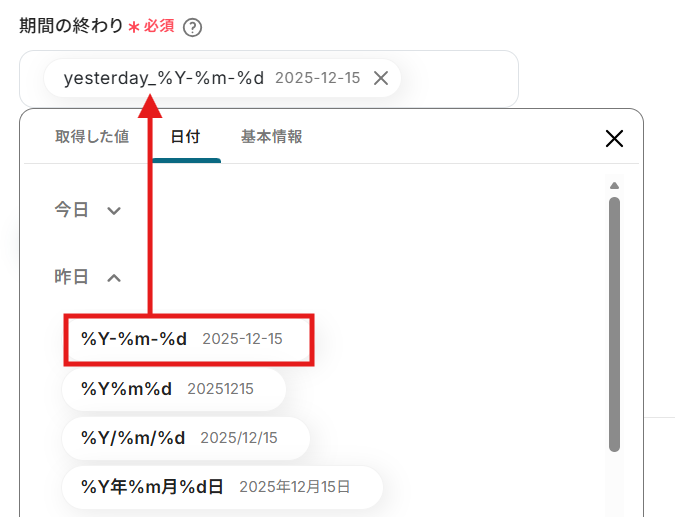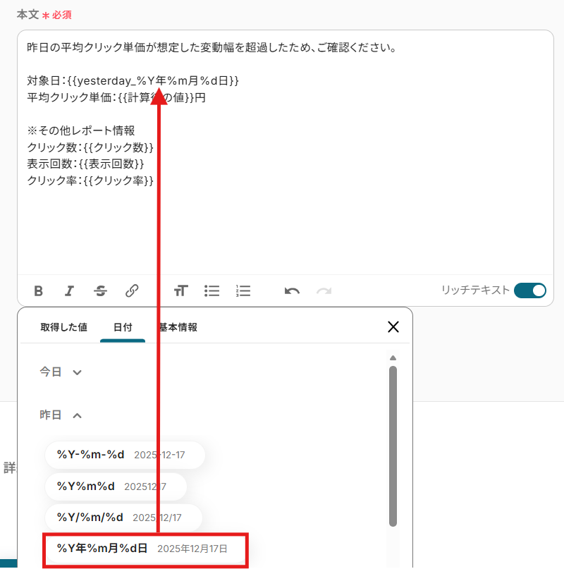 日付を入れたい場合は、編集欄をクリックして、編集欄をクリックして「日付」の「昨日」から希望の形式を選ぶことで、フローボットが起動した日を基準に「昨日」の日付が自動で反映されます。