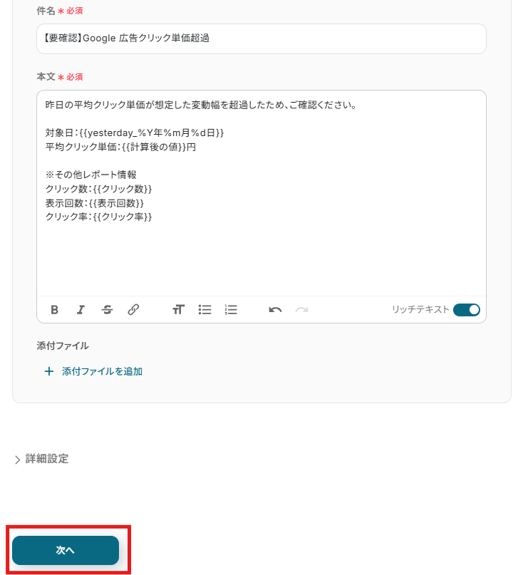 件名と本文の編集が完了したら、「次へ」をクリックします。