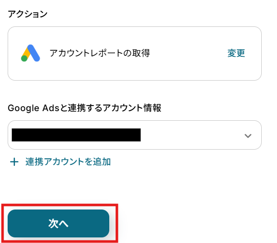 クリックすると以下の画面に移ります。 アカウント情報と書かれた項目にはステップ1でマイアプリ連携した際のアカウント情報が記載されています。 アクションは、「アカウントレポートの取得」のままで次に進みましょう!