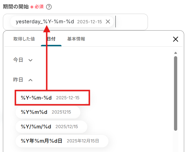 次に、取得するレポートの「期間の開始」を指定します。 今回は、「昨日」のレポートを取得する設定 を例に説明します。 編集欄をクリックし、日付から「昨日」を選択し、赤枠内の形式を指定してください。