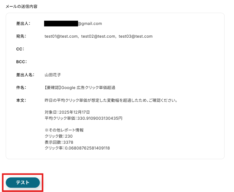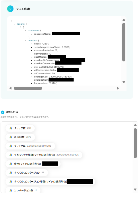 入力できたら、テストを実行しましょう。 テストが成功して、円単位で平均クリック単価を取得 できました! 「完了」をクリックして設定完了です!
