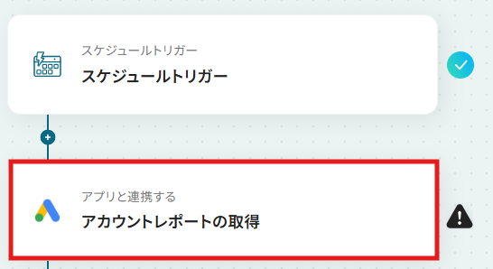 ステップ4:Google Adsのアクション設定 Google Adsからレポートを取得する設定を行います。 「アカウントレポートの取得」をクリックしてください。