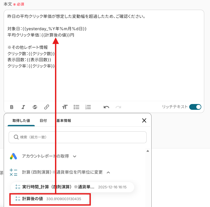 【補足】 「計算後の値」とは、ステップ5で取得した円単位の平均クリック単価 のことです。