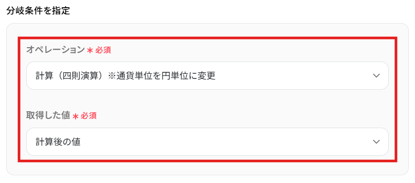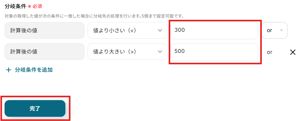 分岐条件もテンプレートであらかじめ設定されています。 下記画像を参考にして、赤枠内に、「この範囲を超えたら通知を送りたい」という予算を任意で入力してください。