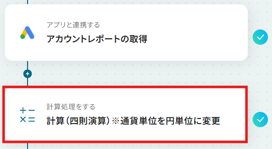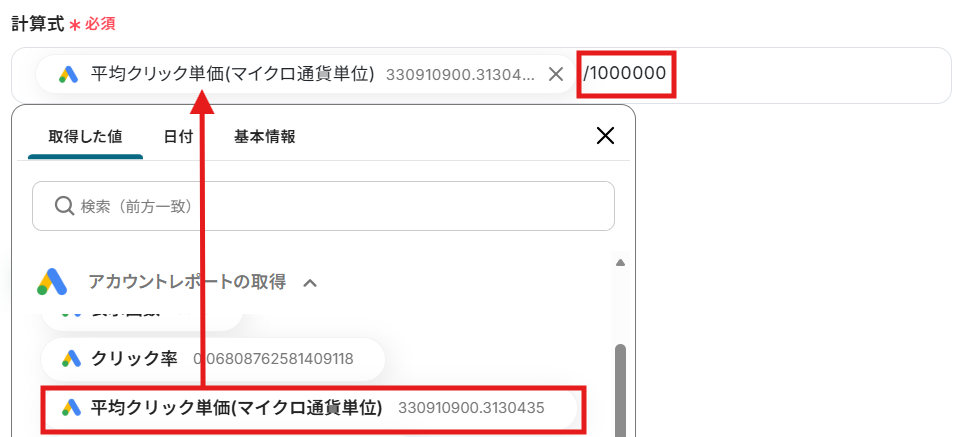 ステップ5:計算設定 次に、ステップ4でマイクロ通貨単位で取得された「平均クリック単価」を円単位に変換する設定を行います。 「計算(四則演算)※通貨単位を円単位に変更」をクリックしてください。