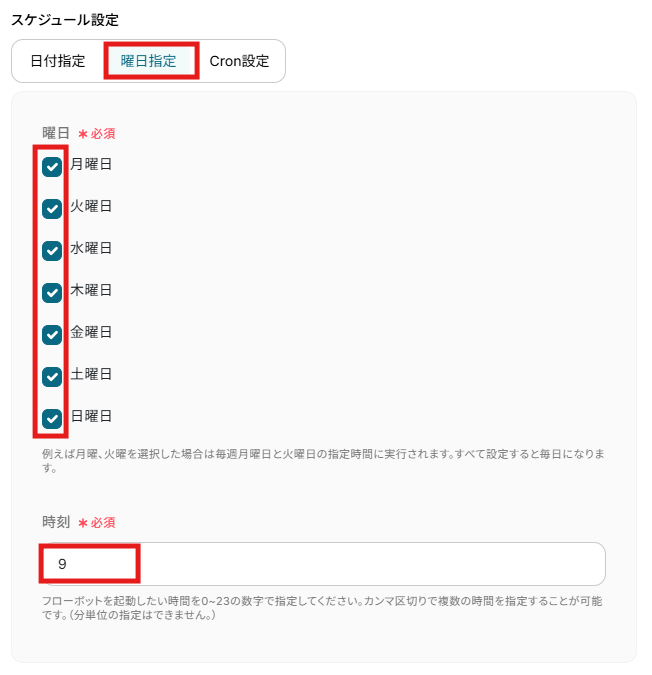 日付指定、曜日指定、Cron設定から希望の形式を選んでスケジュールトリガーを設定しましょう。 詳しい設定方法については、下記をご参照ください。