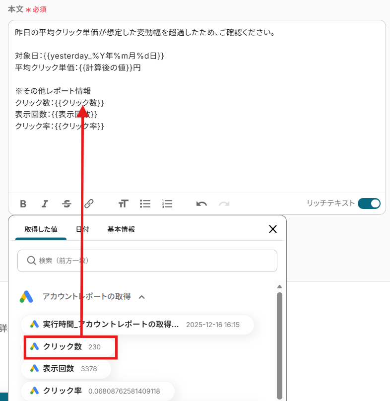 はい、可能です! ステップ4で取得したクリック数・表示回数・クリック率・平均クリック単価・費用・コンバージョン・検索広告のインプレッションシェア・インタラクション率など、さまざまなデータを通知できます! 運用イメージに合わせて、メール本文をカスタマイズしてご活用ください!