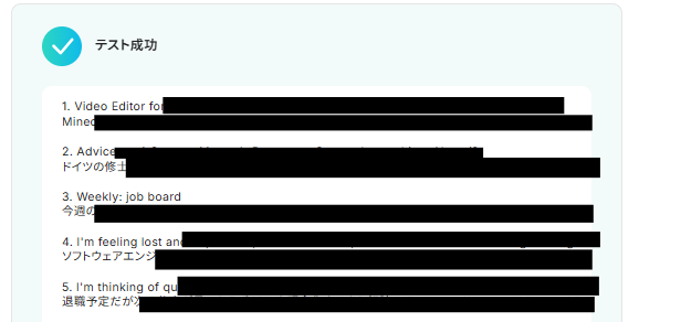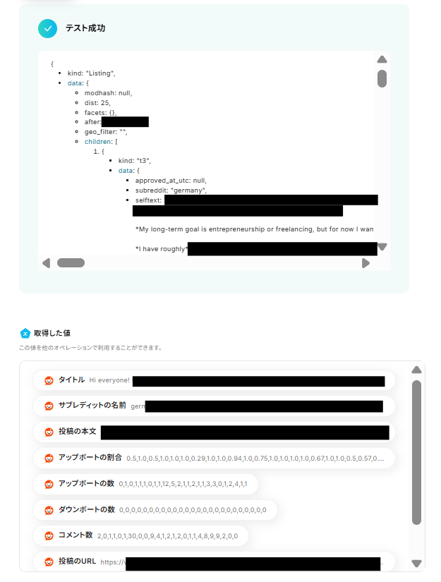 ここまで設定したらテストボタンをクリックしてください。テストが成功すると取得した値が入ります。