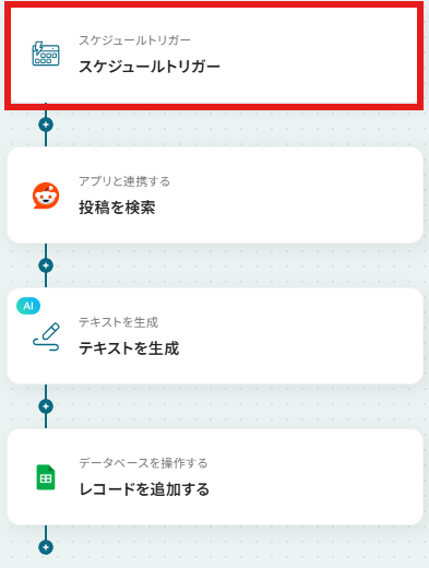 - スケジュールトリガーの設定とReddit、Google スプレッドシートのアクション設定