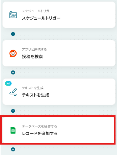 最後にGoogle スプレッドシートにレコードを追加していきます。「レコードを追加」をクリックしてください。